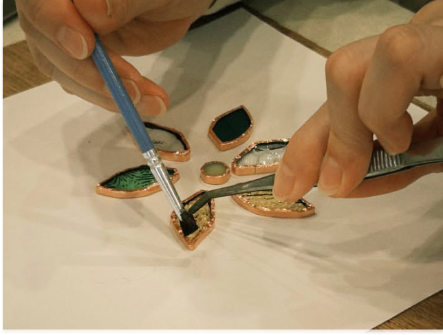 好きな色のガラスを選び、銅テープ巻き・はんだごて作業・洗浄・磨きなどの制作作業開始 |